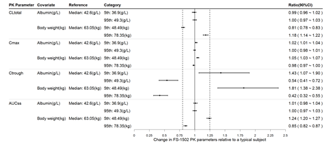 协变量对FS-1502按照体重给药后ADC稳态PK参数的影响
